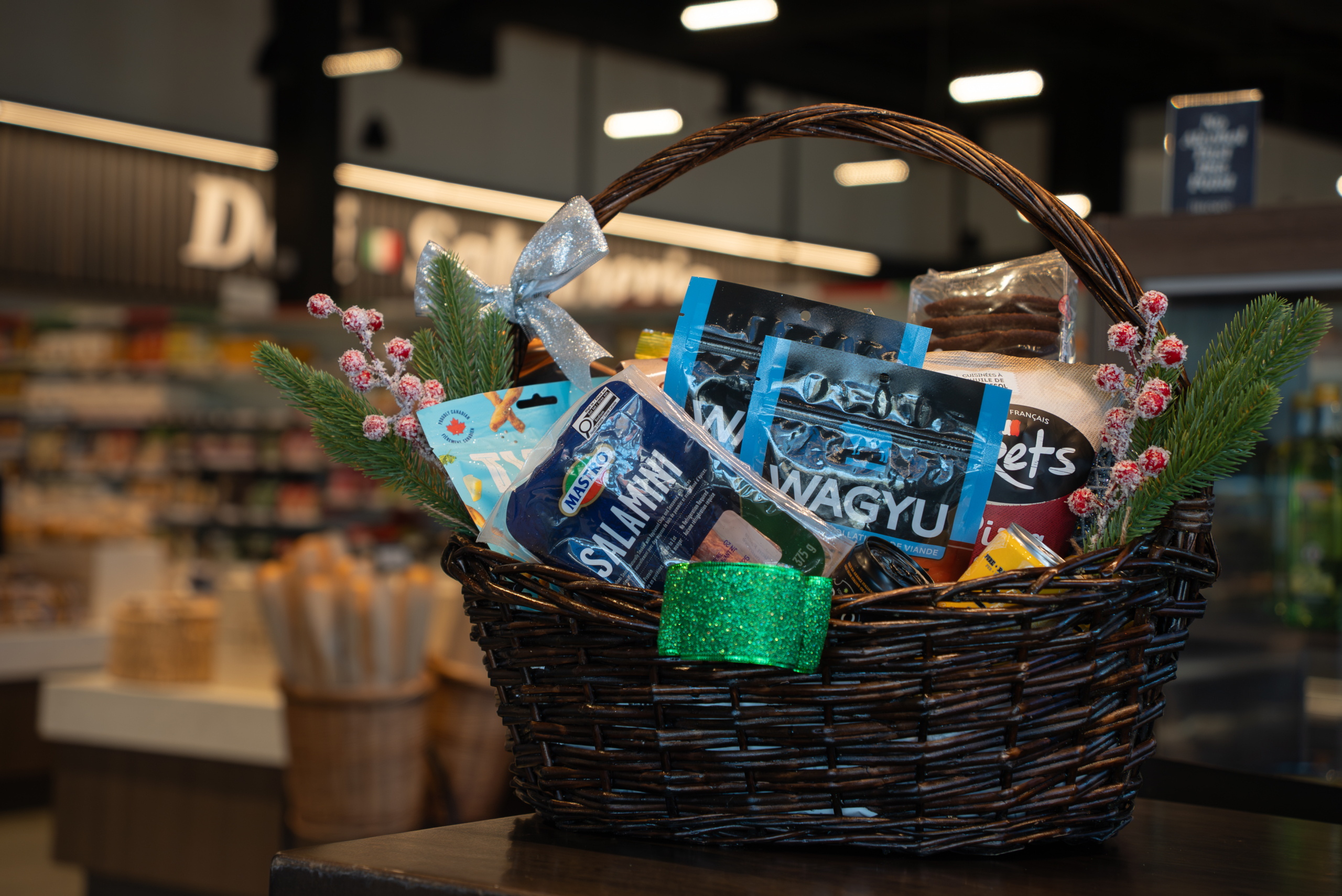 A playful assortment of snacks and drinks ready to delight any palate. Perfect for gatherings, movie nights, or simply indulging yourself. Basket includes: Gioia Amaretti Biscuits, Vitavigor Breadsticks, El Valle Cured Cheese Chips, El Valle Black Truffle Chips, Bretz Chips Pizza Flavor, Loacker Quadratini Cappuccino, Wagyu Sweet Heat Jerky, Wagyu Teriyaki Jerky, Milano Chocolate Lady Fingers, Mastro Salamini, Crodo Aranciata, Belicious Limoncello, Macario Limonata, Macario Aranciata Rossa, Twigz Buttery Herb & Garlic Pretzels